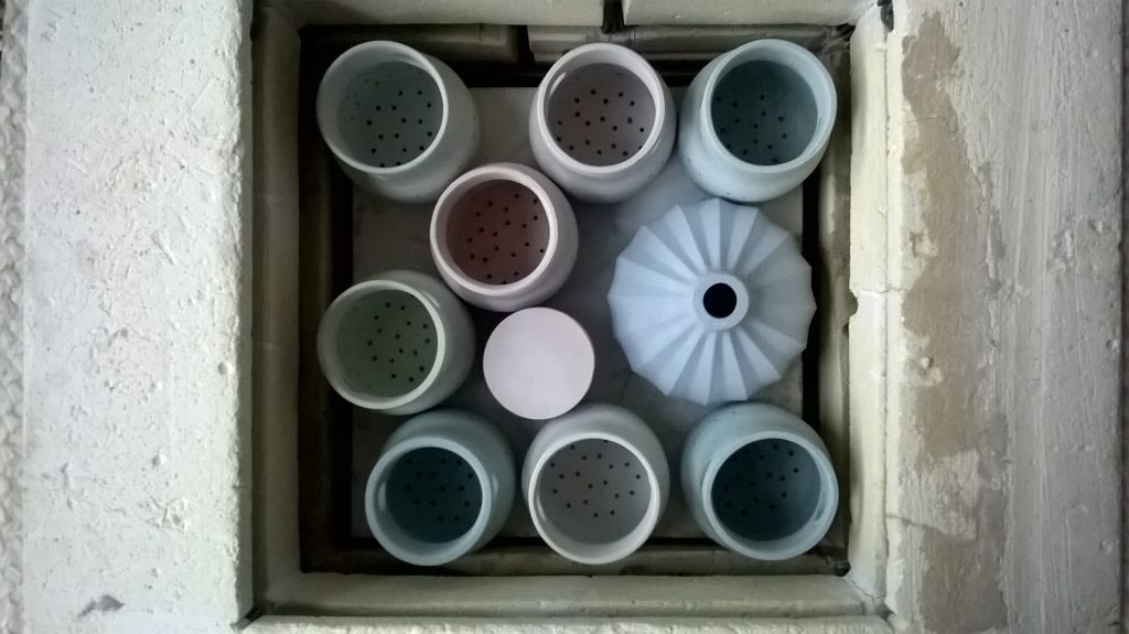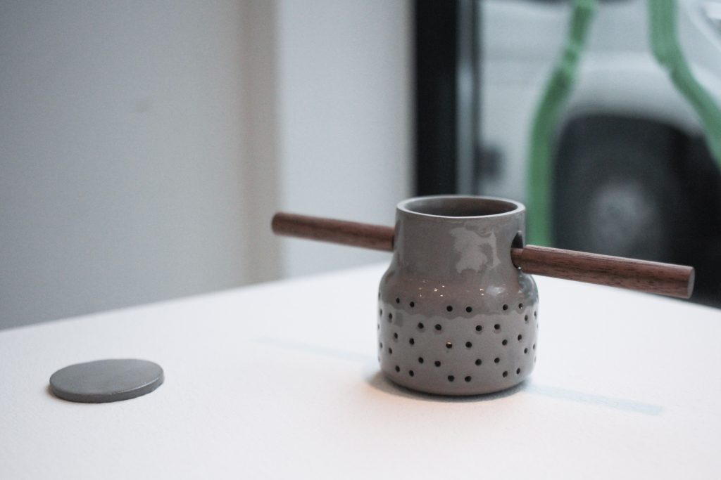 In die gegossene Form werden händisch die Löcher gebohrt. Nach dem Schrühbrand wird geschliffen und glasiert und noch einmal hoch gebrannt. Zuletzt wird jedem Exemplar ein Holzstab verpasst und es ist bereit für den Tee.