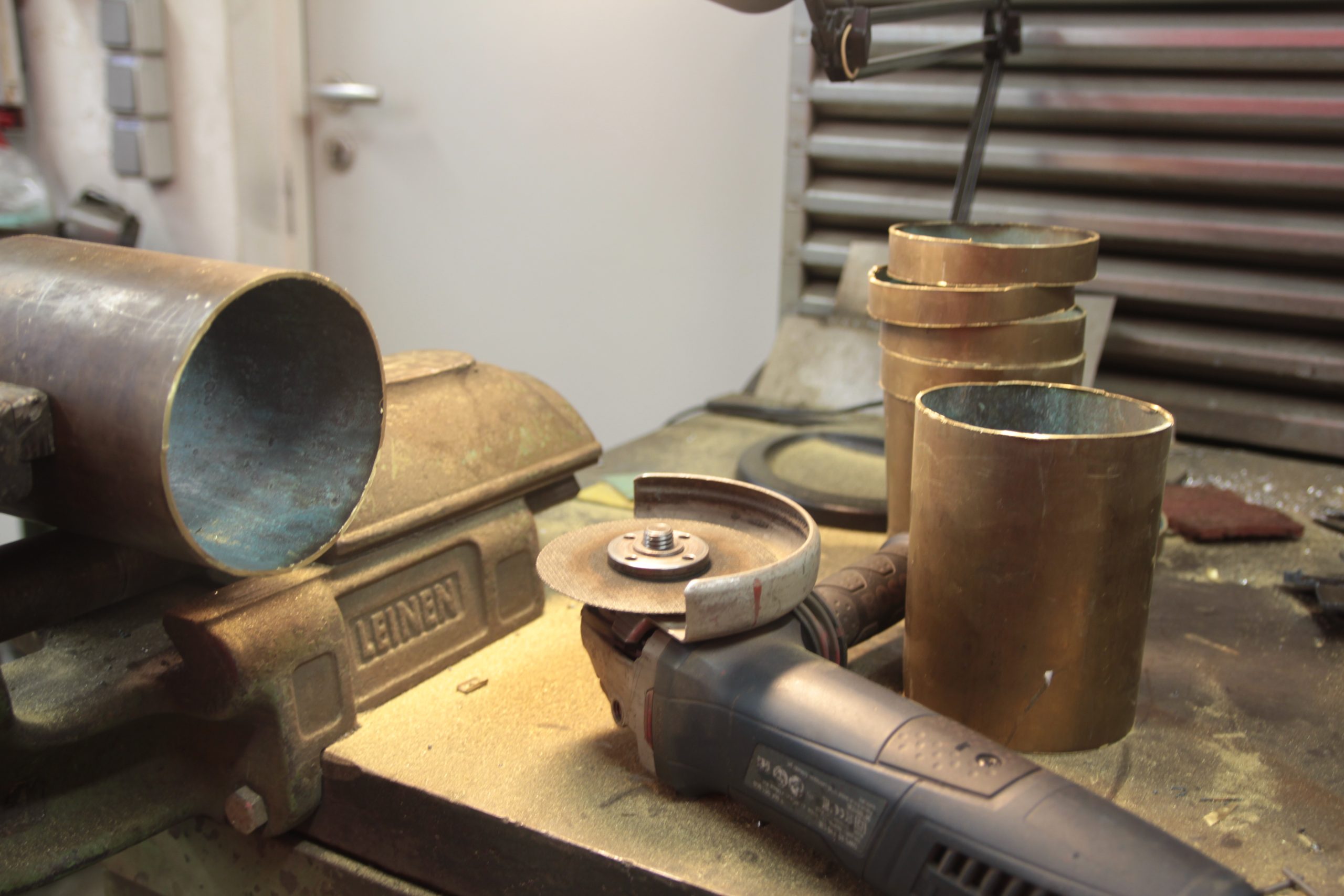 In der Top 5 der Waffenlieferanten weltweit exportieren wir auch in Krisengebiete. Wie viele Menschenleben ein 105mm Geschoss im Schnitt kostet, weiß keiner. Der Materialwert einer alten Hülse einer Feldhaubitze liegt beim Altmetallhandel bei ca. 19Euro. Nach ihrer Maniküre mit Flex, Bandschleifer, Zinnlot, Poliermaschine und Waffenöl kann man ihre Herkunft nur noch erahnen. In ihrem neuen Leben sind sie robuste Utensilos. Sie finden ihren Platz überall, wo du sie brauchen kannst und erinnern stumm an die Sinnlosigkeit von Krieg und Gewalt und an unser glänzendes Glück hier in Frieden leben zu können.