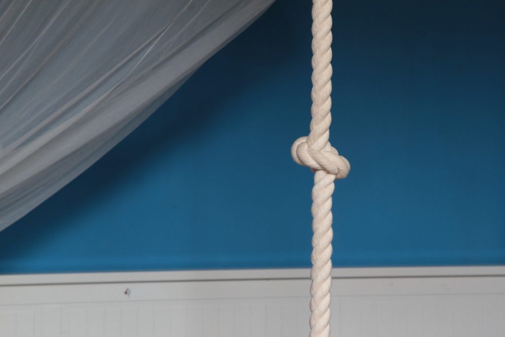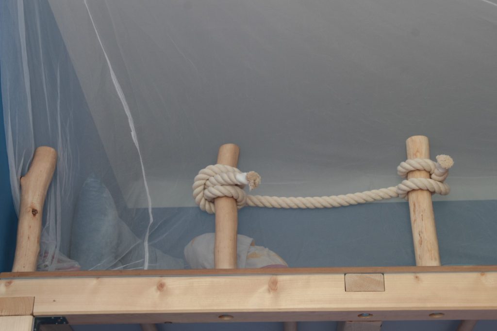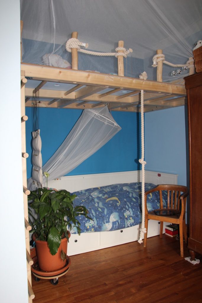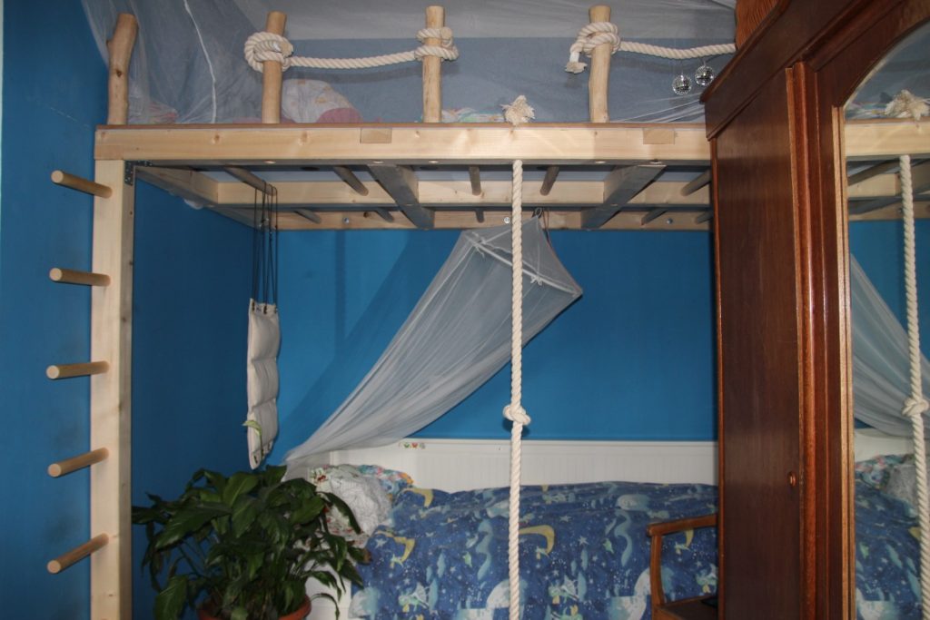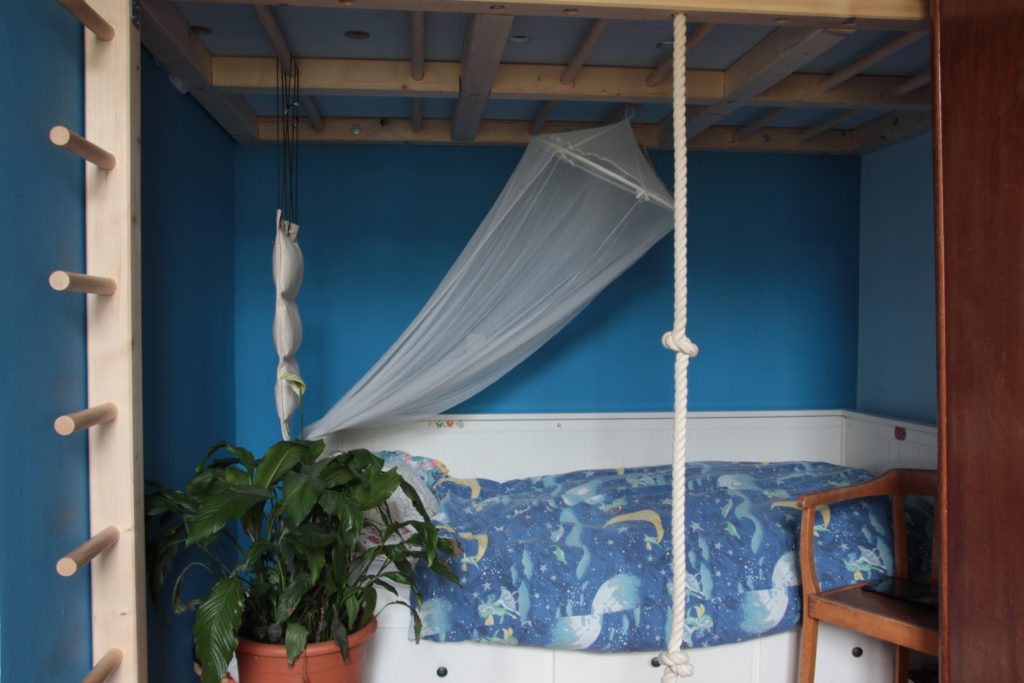 Geplant und umgesetzt wurde ein Jugendzimmer für eine 12-Jährige. Die Wünsche nach einem ruhigen, nicht direkt erreichbaren Rückzugsort, blauer Farbe und Kletterelementen konnten in einer variabel nutzbaren Hochebene vereint werden. Verwendet wurden natürliche Materialien und Farben. Wildholzelemente, Baumwollseil und Fichtenholz in Verbindung mit der dreistufig abgetönten blauen Wandfarbe und der weiß abgesetzten Raumdecke ergeben ein harmonisches Zusammenspiel, zum Verweilen oben und unten.
